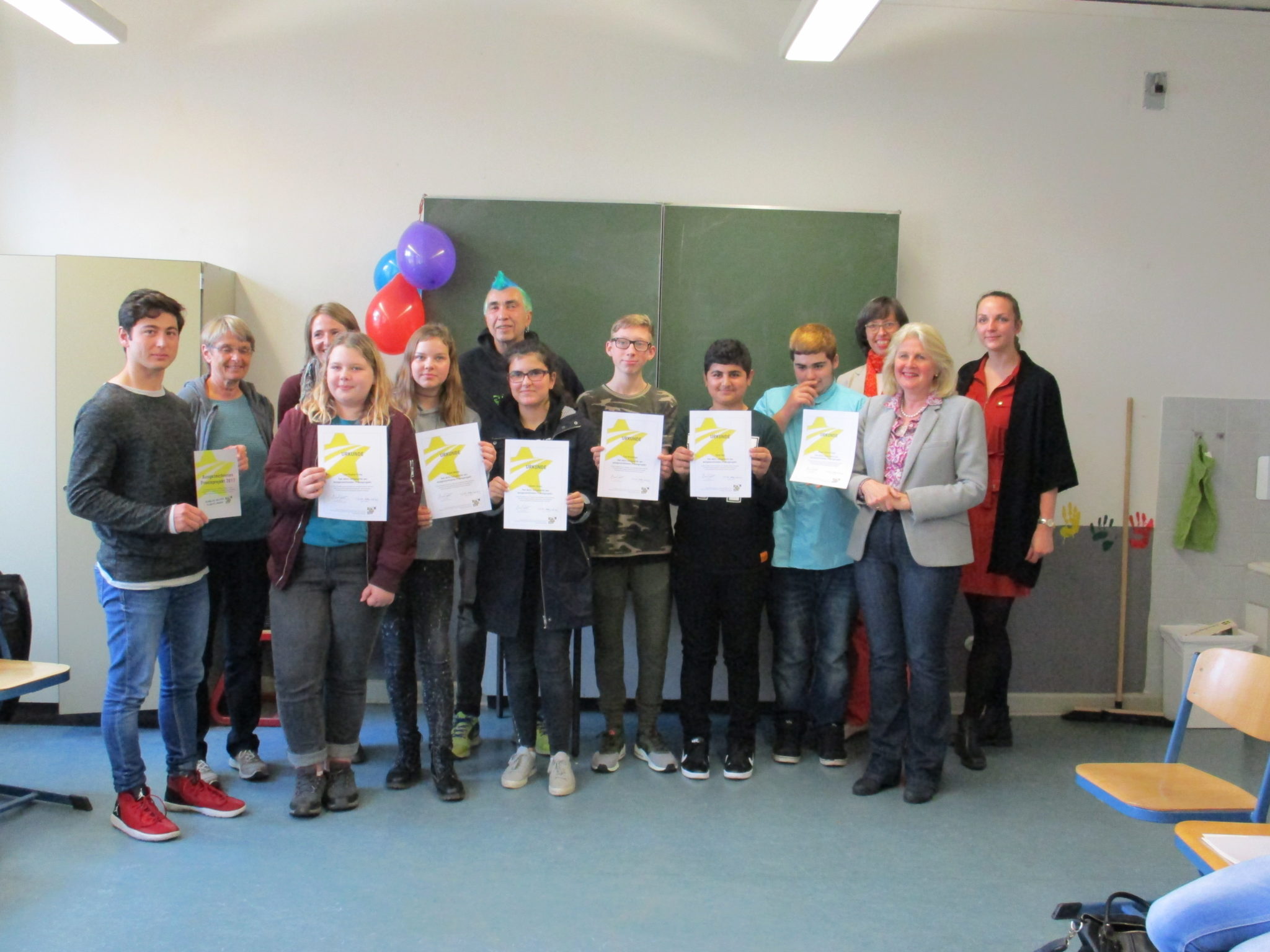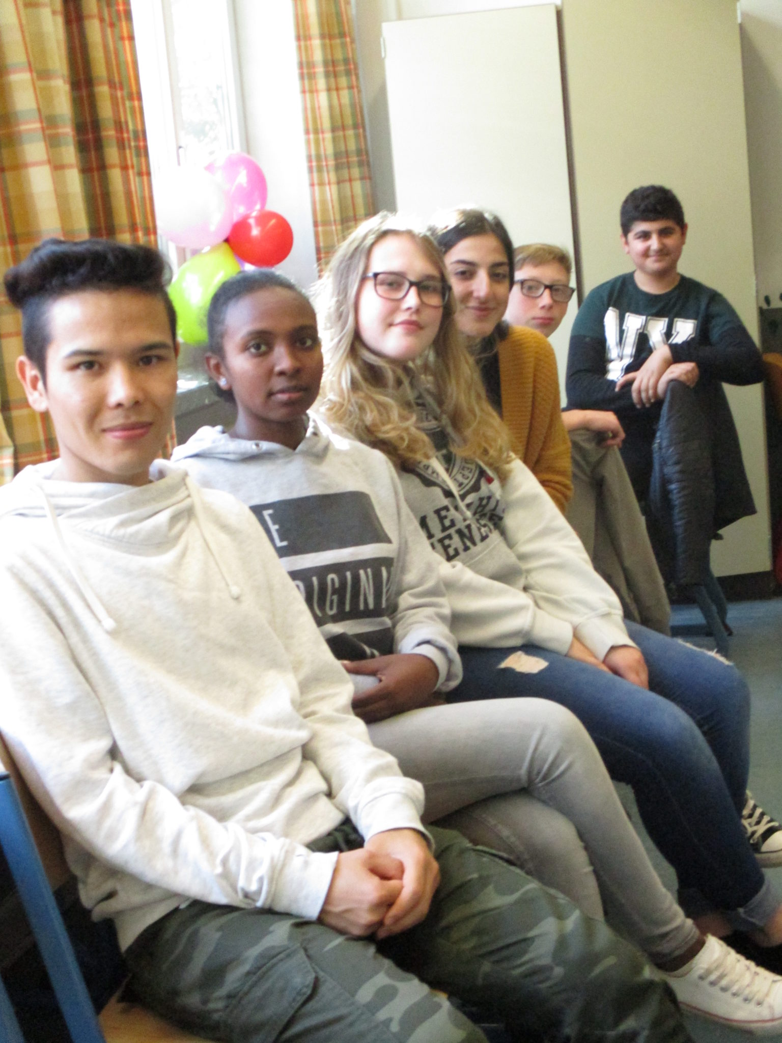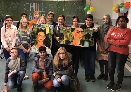 Nach einem Dreivierteljahr Vorbereitung und tatkräftiger Arbeit konnten wir am Mittwoch, den 12. Oktober 2016, endlich unsere „Chill-Lounge“ einweihen. Festlich geschmückt und bei einem leckeren Imbiss, mit dem uns ein Kurs verwöhnte, hielten wir eine kleine Feier ab, zu der auch Vertreter der Eltern, des Schulvereins und der Kommunalpolitik kamen. Besonders freuten wir uns über unsere Patin für das Projekt „Schule gegen Rassismus-Schule mit Courage“, die eine lobende Ansprache hielt, uns zwei wunderbare Bilder von Frida Kahlo schenkte und uns zur Eröffnung einen goldenen Schlüssel übergab. Musikalisch wurde unsere Feier von einem Stück der „Lebenskünstler“ begleitet.