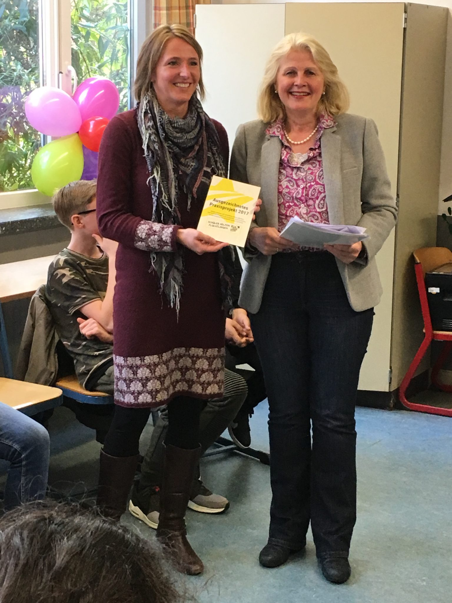Beeindruckt hat uns, wie Sie Ihre Schülerinnen und Schüler unterstützt haben, sich zu engagieren. An den Nachmittagen gibt es viele Kurse und den Schülern fehlte ein Rückzugsort, um die Zeit zu überbrücken. Davon waren besonders die Sprachlernklassen betroffen. Eine Schülergruppe entwickelte ein Konzept, besorgte Farben, sammelte Spenden und veranstaltete ein Möbel-Casting. Es war eine tolle Teamarbeit, mit guter Laune wurden die Wände gestrichen, Möbel gerückt und Bilder aufgehängt. Es gab sogar eine Einweihungsfeier für die „Chill-Lounge“ und die Schüler freuten sich, dass sie Seite an Seite mit- und füreinander an dem Raum gearbeitet haben. Es ist ein Ort der Begegnungen geworden, in dem sich auch Lehrkräfte gerne aufhalten und auch schon ein Buchautor eine Lesung gehalten hat. Ihre Schule lebt vor, wie Integration funktioniert – dafür zeichnen wir Sie aus. Das Praxisprojekt der Gotthard-Kühl-Grund-und-Gemeinschaftsschule ist ein Vorbild für ganz Deutschland.