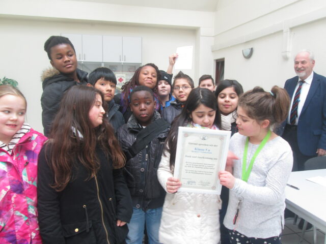 Ein paar Monate später: Die Klasse 5a der Brüder-Grimm-Schule hat einen ganz besonderen Beitrag für die Willkommenskultur geleistet und kann jetzt, am Ende des Schuljahres stolz auf das zurückblicken, was sie mit viel Engagement geleistet hat. Das Sammeln von Sach- und Geldspenden in den Pausen, aber auch der Kleider- und Spielzeugflohmarkt am Tag der offenen Tür hatte sich gelohnt! Die Schüler haben 200 Euro eingenommen und sich entschlossen, dieses Geld als Spende für die Unterstützung von Flüchtlingskindern an das Deutsche Rote Kreuz zu geben. Bei der feierlichen Übergabe erhielt die Klasse eine Urkunde und ein großes Lob von Herrn Roland Wartenberg, dem Kreisgeschäftsführer des Roten Kreuzes in Wandsbek, der in seiner Dankesrede bemerkte, dass es nicht sehr oft vorkomme, dass Schulklassen bereit seien, für einen guten Zweck Geld zu sammeln und dieses dann gezielt einer Organisation zu spenden. In einem kleinen Festakt durften Addil und Gracjan eine Rede halten, die sie vorher einstudiert hatten. Viele Sachspenden, die nicht mehr verkauft werden konnten, wollten die Schüler dann direkt in ein Flüchtlingsheim bringen. Es handelte sich um Kinderkleidung und Spiele. Obwohl Flüchtlingsheime sehr strenge Anweisungen haben, welche Art von Spenden nur angenommen werden dürfen, arrangierte Eda einen Termin, zu dem alle Mädchen die Spenden einpackten und in das Flüchtlingsheim schleppten. Diese Erfahrung war sehr wichtig, denn keines der Kinder hatte bisher ein Flüchtlngsheim von innen gesehen. Die Spenden wurden entgegengenommen, da man den Enthusiasmus der Kinder nicht bremsen wollte.