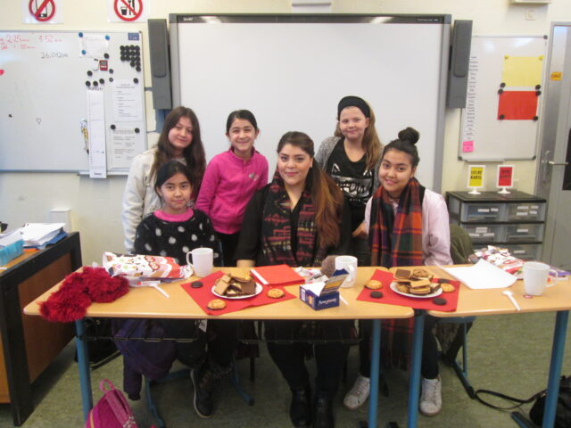 Treffen mit Parisah und Machdiye aus Afghanistan: Durch die relativ spontane Umorganisation des Projektes von einer Kleider- hin zur Geldspende wurde kurz der zweite Fokus verloren: Da die Spendenaktion ja in den Pausen und im Gesellschaftsunterricht organisiert wurde, fehlte die Zeit, um sich mit den Menschen, um die es ja eigentlich gehen sollte, und deren Geschichten zu beschäftigen. Daher wurde jetzt vorgeschlagen, Flüchtlinge in die Klasse einzuladen und sie zu befragen, wie es ihnen in Hamburg geht und wie eine Hilfe aussehen könnte, die sich jetzt konkret auf ihre Bedürfnisse nach sprachlicher oder sozialer Integration bezieht. Dazu wurden Gespräche mit den Eltern geflüchteter Kinder und Jugendlicher geführt. Außerdem wurden Dolmetscher und Dolmetscherinnen gesucht, die sich bereit erklärten, die Fragen der Klasse zu übersetzen. Dieser direkte Kontakt war gewünscht und wichtig für die Klasse, damit sie sich ein Bild machen konnte, womit die Flüchtlinge in Hamburg zutun haben: Vielleicht Schwierigkeiten, die Sprache zu lernen, Freunde und Freundinnen kennenzulernen, auch wieder mal ein eigenes Zimmer zu haben. Die Schüler hatten mindestens 50 Fragen gesammelt. Alles war bereit. Die Kontaktaufnahme allerdings gestaltete sich als sehr schwierig, denn aus sehr unterschiedlichen Gründen misslangen unsere Einladungsversuche. Kinder im Alter unsere Schüler waren noch nicht in der Lage, alleine mit öffentlichen Verkehrsmitteln anzureisen. Aber dann hatte die Klasse sehr viel Glück, denn auf Vermittlung der Lehrerin Mitra Ahmadi konnten zwei Mädchen eingeladen werden, für die sich die Klasse ein besonderes Programm ausgedacht hatte: Es wurden Fragen vorbereitet, die übersetzt werden sollten, es wurden kleine Geschenke besorgt, Kekse, Kuchen und Getränke sollten bereit stehen.