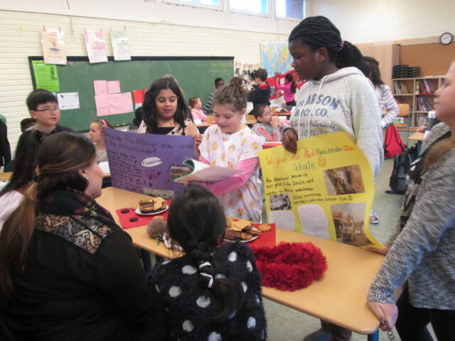 Zwei sympathische Mädchen, Parisah und Machdiye, beide mit ihrer Familie aus Afghanistan geflohen, konnten schon etwas Deutsch sprechen und viele Fragen ohne Dolmetscherin beantworten. Eine wesentliche Erkenntnis der Klasse war während des Gesprächs, dass auch Flüchtlingskinder ganz „normale“ Kinder sind, mit Wünschen und Interessen, die von unseren Schülern geteilt wurden. Danach wurden Parisah und Machdiye die Schule gezeigt. Der Schulzoo war ganz besonders interessant. Sie spielten zusammen mit der Klasse, guckten sich den Film „Die Minions“ an und als es Zeit war, wieder nach Hause zu fahren, war die Klasse sehr traurig. „Könnt ihr denn nicht bei uns bleiben?“, fragten die Schüler der 5a und auch in den Briefen, die die 5a dann später an die beiden Mädchen geschrieben hat, wurde wehmütig angemerkt: „Könnt ihr nicht in unsere Klasse kommen? Das wäre sehr schön!!!“