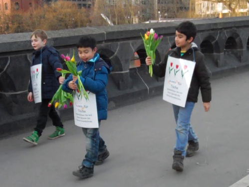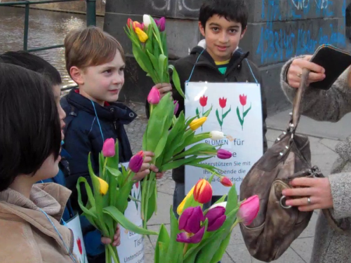 dankeschön spende junge mit rosenAm Ende sah es dann so aus: Die 2 Klassen verteilten für 2 Stunden an einem Standort, ab 13 Uhr übernahmen dann die Eltern an insgesamt 3 Standorten. Bis 16 Uhr waren alle Tulpen weg. Die Kinder haben neben all dem Spaß auch eine Menge gelernt. Sie haben sich aktiv für ihre Schule eingesetzt, nahmen Kontakt zu vielen unterschiedlichen fremden Menschen auf und erlebten, wie diese meist positiv reagierten. Immer wieder kam es zu interessierten Nachfragen der Leute. Die Kinder waren also auch als ernsthafte Gesprächspartner gefragt. Eine wunderbare Gelegenheit, auch innerlich zu wachsen. Schön war auch, dass die Schule uns innerhalb kürzester Zeit bei der Logistik (z.B. Transport der Blumen und Plakate) unterstützt hat. Innerhalb der teilnehmenden Klassen musste auch einiges organisiert werden. Alle hatten ein Ziel und haben wunderbar zusammen gearbeitet. Außerdem haben wir erleben dürfen, wie schnell sich unter den Eltern Helfer fanden. Diese mussten auch sehr flexibel sein, da wir bis zuletzt nicht genau wussten, wie viele Blumen wir tatsächlich bekommen. Eine Mutter war als rasende Fotoreporterin unterwegs, andere Eltern drehten kurze Videosequenzen.
