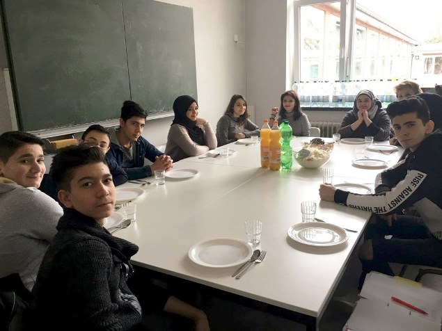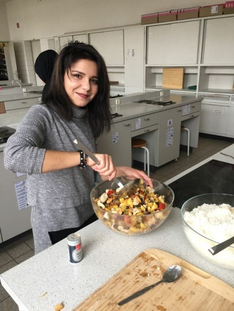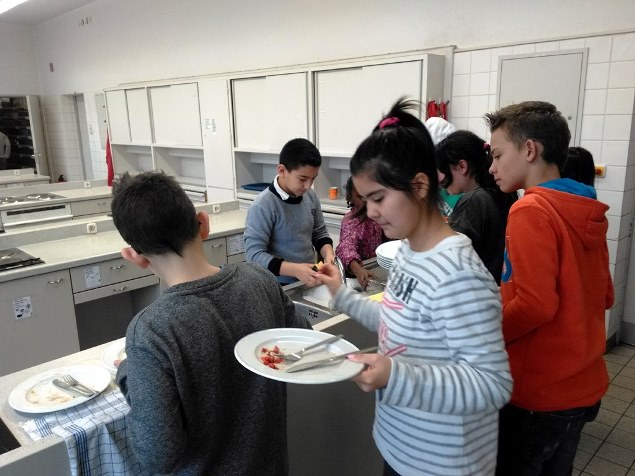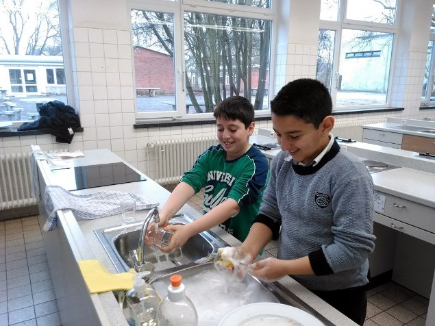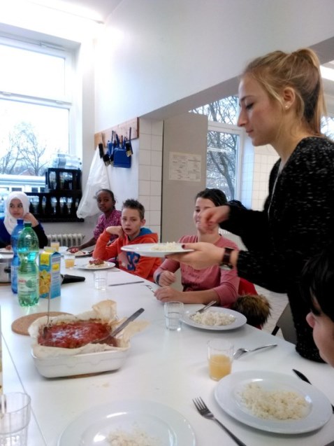 Einmal wöchentlich kommen zwei Mitarbeiter der Johanniter Jugend zu uns in die Schule und kochen mit den DaZ-Schüler nach mitgebrachten Rezepten Gerichte aus den Herkunftsländern. Es wird zusammen eingekauft, gekocht, gegessen und aufgeräumt.