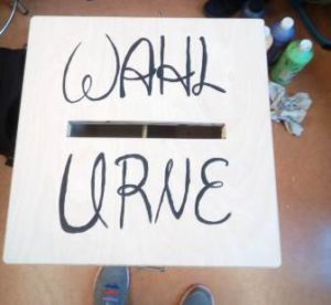 Projekt für den Werk- und Kunstunterricht: Eine Wahlurne sollte im Werkunterricht (oder den Kollegen in der Werkstatt) hergerichtet und durch die Kunst gestaltet werden. Natürlich kann man auch einen Kopierpapierkarton nehmen und mit Paketband fest verkleben. Viel erlebnisreicher und authentischer ist doch so eine selbst hergestellt Box. 🙂