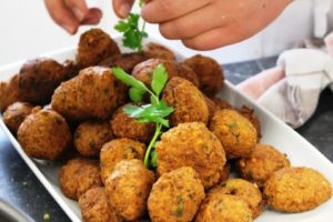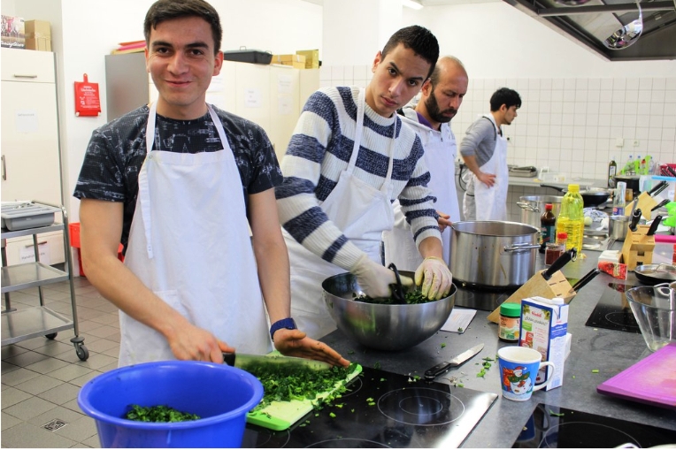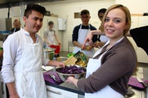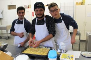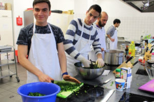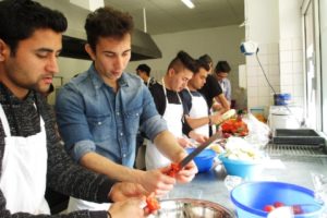 DURCHFÜHRUNG der Projektidee KOCHEN VERBINDET!: Finanziert durch den Werkstatt-Berufskolleg Spendenlauf im Jahr 2016 haben wir sechs Mal in unserer Schulküche mit deutschen und internationalen Schülern gekocht. Zwei Gruppen unseres Berufskollegs, Auszubildende zur Servicefachkraft für Ernährung- und Servicemanagement und Schüler aus einer internationalen Klasse, haben jede Woche in vier Unterrichtsstunden gemeinsam ein internationale Gerichte gekocht – und beim gemeinsamen Kochen Berührungsängste abgebaut. Anfangs lief das erwartungsgemäß etwas schleppend an, da man sich erstmal kennenlernen musste, aber schon nach kurzer Zeit herrschte überall hektische Betriebsamkeit. Das gemeinsame Essen am Ende der Einheiten bildete jedes Mal den leckeren Abschluss. Da die Schüler an unserem Berufskolleg aus insgesamt 17 Nationen kommen, standen in jeder Woche Gerichte aus einem anderen Land im Speise-Fokus. Zwischen 20 und 25 Personen wuselten in der Schulküche herum, gerade noch genug Platz für so viele Beteiligte. Glücklicherweise gab es jedes Mal viele Aufgaben, denn ein landestypisches Hauptgericht, eine Beilage, ein Salat und ein Dessert sorgten dafür, dass alle bei der Vorbereitung gut zu tun hatten.
