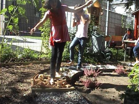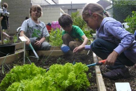 Einen Schulgarten mit Gemüsebeeten und Forschungsstationen anlegen, der sowohl vom Offenen Ganztag nachmittags als auch für den Schulunterricht genutzt wird. Die Schulgartenstunde ist für jede Klasse im Stundenplan verankert.