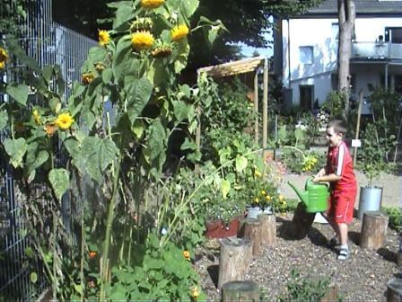 Von März bis Ende Oktober haben wir den Garten angelegt. Fernsehgärtner Rüdiger Ramme war 8 Mal zu Drehs bei uns und hat uns mächtig geholfen. Auch Eltern haben regelmäßig geholfen. Wir haben auf den 8 Klassenbeeten in diesem Jahr angesäht/gepflanzt: Gurke, Tomate, Zucchini, Kürbis, Zuckermais, Kohlrabi, Kartoffeln, Auberginen, Stangen- und Buschbohnen, Sellerie und verschiedene Kräuter. Die Schüler waren begeistert. Gut war, dass wir den Schulgarten in den Unterricht integriert haben. Jede Klasse hatte alle zwei Wochen Schulgarten auf dem regulären Stundenplan. So kamen alle Kinder mit dem Garten und den Themen in Kontakt. Neben den Klassenbeeten haben wir noch ein Obstspalier mit verschiedenen Obstbäumen angelegt, verschieden Beerensträucher, ein Rosen- und ein Staudenbeet und noch einen Barfuß-Weg mit verschiedenen Naturmaterialien. Der wird von allen Kindern geliebt.
