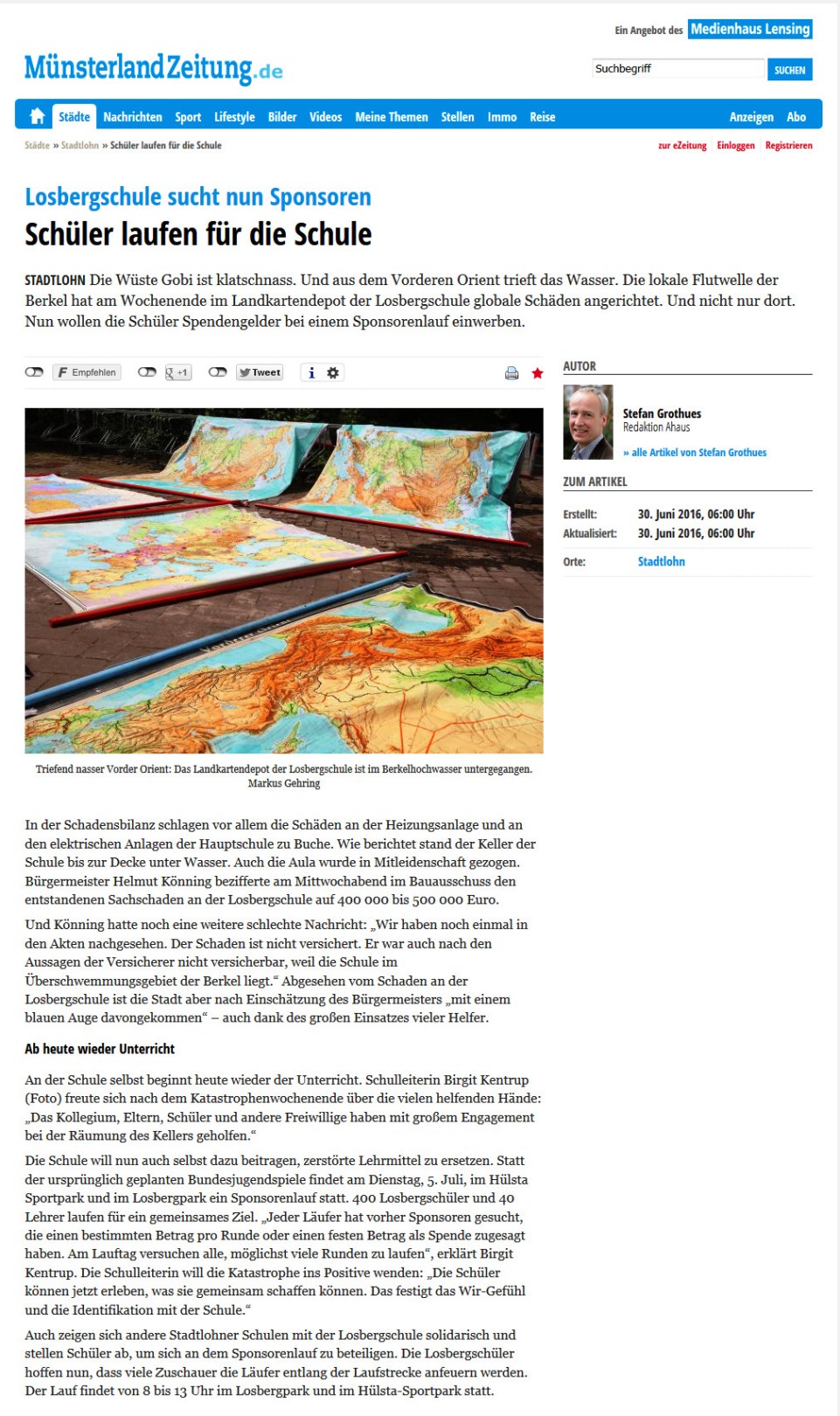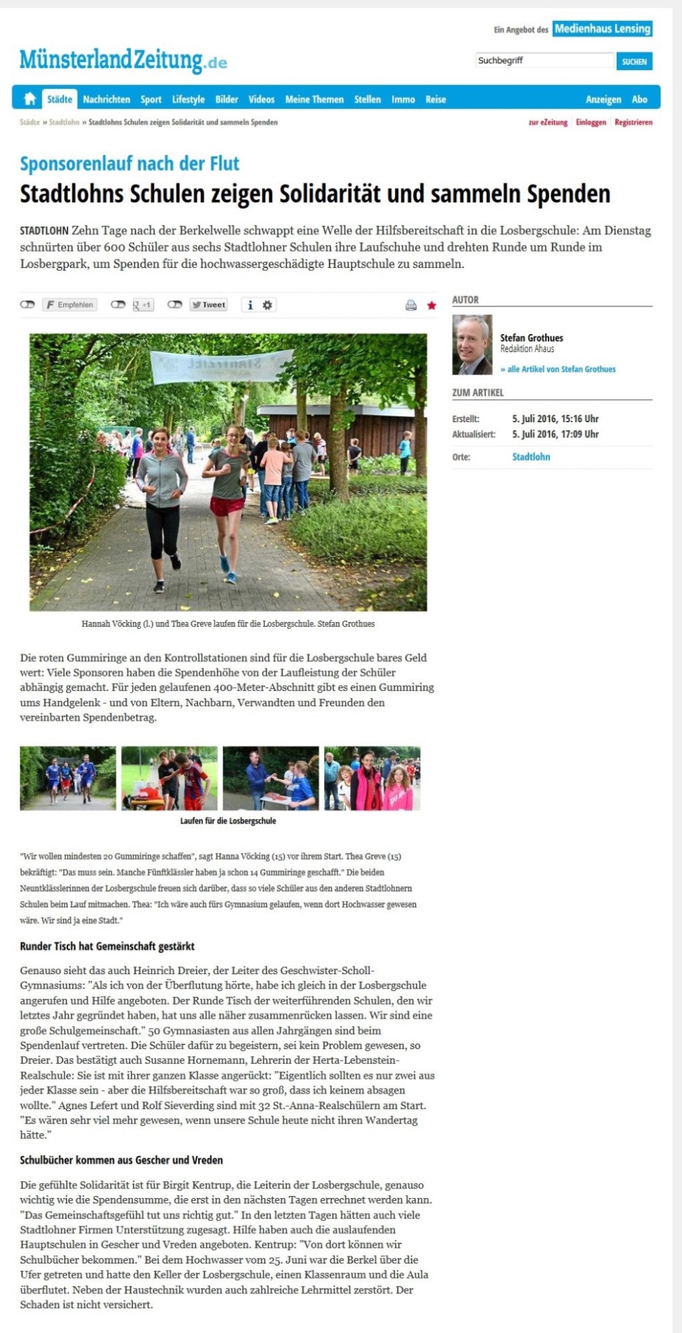 Ergebnis: Die Münsterland Zeitung vom 05.07.2016 berichtet: „Zehn Tage nach der Berkelwelle schwappt eine Welle der Hilfsbereitschaft in die Losbergschule: Am Dienstag schnürten über 600 Schüler aus sechs Stadtlohner Schulen ihre Laufschuhe und drehten Runde um Runde im Losbergpark, um Spenden für die hochwassergeschädigte Hauptschule zu sammeln.“ Dank der großen Solidarität der anderen Schulen und des St. Elisabeth Hospizes konnten ca. 14.000 Euro eingenommen werden. Noch nicht inbegriffen sind die Spenden der Stadtlohner Firmen, die sich ebenfalls sehr großzügig zeigten. (Quelle: Losbergschule Stadtlohn)