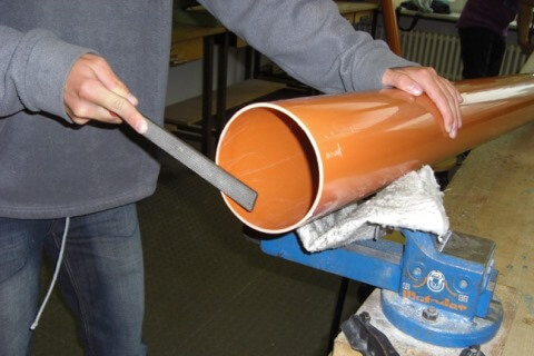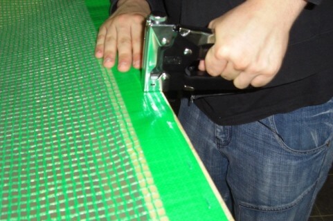 Zu Beginn des neuen Schuljahres bildeten sich dann 5 Kleingruppen, die arbeitsteilig an verschiedenen Projektschwerpunkten weiterarbeiteten: 4 Schüler kümmerten sich um den Bau der zwanzig Seitenelemente, 2 dann anschließend um das Zuschneiden und Anbringen der Folien, 2 weitere um die acht Rundhölzer und Rohre, 3 um den Bau der acht Stützen und 2 Schüler bauten die beiden Tore zusammen.