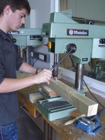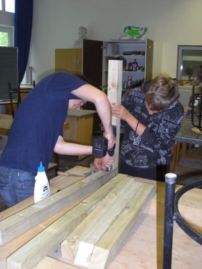 Die Schüler haben sehr motiviert und gut gearbeitet, sich zeitweise auch gegenseitig unterstützt und geholfen. Leider gab es einen kleineren Unfall beim Bohren der dicken Rundhölzer an der Ständerbohrmaschine, der aber zum Glück nur eine Handverletzung war, die mit einigen Stichen genäht werden konnte. Zum Ende hin wurde es mit der Zeit etwas knapp, einige Schüler haben dann sogar zusätzlich in den Mittagspausen gearbeitet.