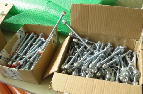 Eckverbindungen IGS VarenheideUm die Kosten einigermaßen im Rahmen zu halten, hatten wir Kontakt zur Firma Continental aufgenommen, die uns schon häufiger bei Projekten unterstützt hatte. Dankenswerterweise fertigte sie uns die benötigten Gewindestangen an und lieferte uns außerdem die entsprechenden Unterlegscheiben und Hutmuttern (je ca. 160 Stück!).