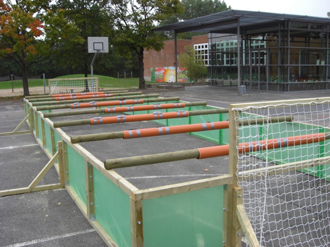 Im Nachhinein liegt hier das größte Problem der Anlage, denn diese Lösung der Handbefestigungen hat nicht lange gehalten. Am Nachmittag wurde die Anlage dann mit einem Eröffnungsspiel Schüler des Technikkurses gegen eine Lehrermannschaft eingeweiht und fand großen Anklang.