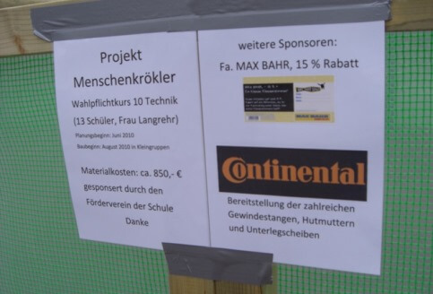 Nach dem Schulfest wurde der Menschenkrökler dann wieder demontiert und in einer Garage gelagert. Die Aufgabe des Technikkurses ist es nun noch, eine bessere Lösung für die Handbefestigungen zu entwickeln. Im Frühjahr soll die Anlage dann für eine längere Zeit auf dem Schulhof aufgebaut bleiben.