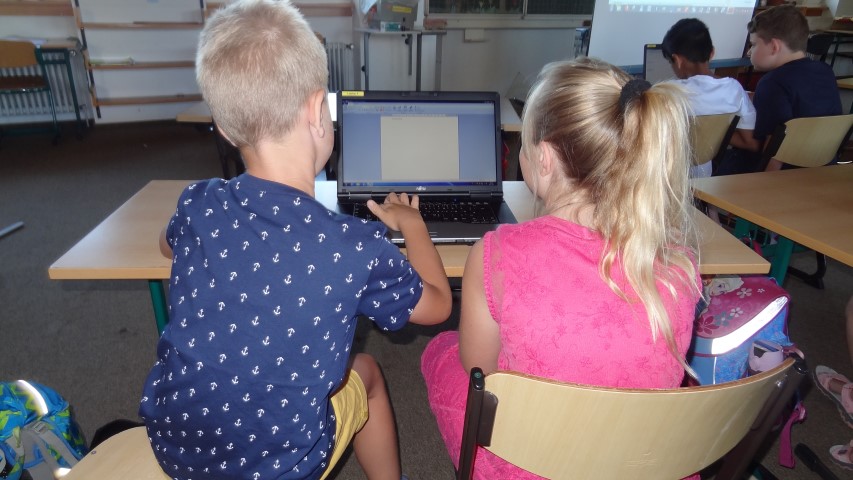 Was unsere Schule angeht, so haben sich zwischenzeitlich die Rahmenbedingungen für den Einsatz der Geräte grundlegend geändert: Hatte ich bei der Bewerbung um die Geräte noch die Aussicht, dass unser Klassensaal, der nicht im eigentlichen Schulgebäude untergebracht ist, sondern auf der gegenüberliegenden Straßenseite, durch eine Funkverbindung an das Internet per WLAN angeschlossen wird, so ist dieser Plan vom Tisch. Der Hintergrund: Die Schülerzahlen im Ort werden durch Neuausweisung von Baugebieten absehbar deutlich steigen. Die Stadt Landau als Schulträger wird daher einen Neu- bzw. Anbau hinter dem alten Schulhaus realisieren. Unser Klassensaal wird dann nicht mehr gebraucht und wird aufgegeben. Das bedeutet, dass ich mit den Laptops den Kindern in erster Linie den Gebrauch und die Handhabung eines Computers vermittle. Wir setzen einen Tageslicht-Beamer ein, mit dem ich z.B. das Bild einer Tastatur auf eine Leinwand projeziere und wir dann lernen, die Tasten und deren Funktionen kennenzulernen und die Position auf der Tastatur sicherer zu finden. Die Kinder nutzen die Geräte in Partnerarbeit, helfen und verbessern sich gegenseitig und dokumentieren ihre Fortschritte im MEDIENKOMP@SS, einem Begleitheft, das das rheinland-pfälzische Bildungsministerium für dieses Thema eigens für Kinder an der Grundschule bis hin zur 6. Klasse (Orientierungsstufe) herausgebracht hat. Im Anschluss an jede Info-Einheit haben die Kinder natürlich auch die Möglichkeit, installierte oder auf CD verfügbare Lernprogramme zu nutzen und das Ganze spielerisch zu vertiefen.