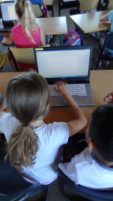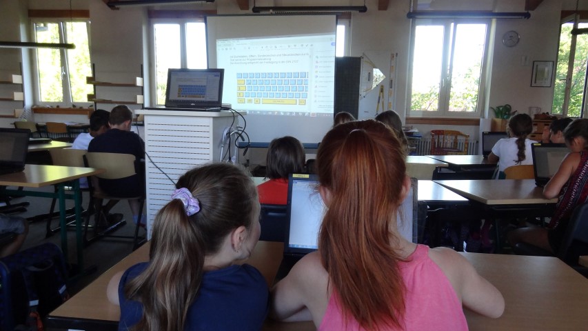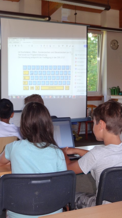 Was unsere Schule angeht, so haben sich zwischenzeitlich die Rahmenbedingungen für den Einsatz der Geräte grundlegend geändert: Hatte ich bei der Bewerbung um die Geräte noch die Aussicht, dass unser Klassensaal, der nicht im eigentlichen Schulgebäude untergebracht ist, sondern auf der gegenüberliegenden Straßenseite, durch eine Funkverbindung an das Internet per WLAN angeschlossen wird, so ist dieser Plan vom Tisch. Der Hintergrund: Die Schülerzahlen im Ort werden durch Neuausweisung von Baugebieten absehbar deutlich steigen. Die Stadt Landau als Schulträger wird daher einen Neu- bzw. Anbau hinter dem alten Schulhaus realisieren. Unser Klassensaal wird dann nicht mehr gebraucht und wird aufgegeben. Das bedeutet, dass ich mit den Laptops den Kindern in erster Linie den Gebrauch und die Handhabung eines Computers vermittle. Wir setzen einen Tageslicht-Beamer ein, mit dem ich z.B. das Bild einer Tastatur auf eine Leinwand projeziere und wir dann lernen, die Tasten und deren Funktionen kennenzulernen und die Position auf der Tastatur sicherer zu finden. Die Kinder nutzen die Geräte in Partnerarbeit, helfen und verbessern sich gegenseitig und dokumentieren ihre Fortschritte im MEDIENKOMP@SS, einem Begleitheft, das das rheinland-pfälzische Bildungsministerium für dieses Thema eigens für Kinder an der Grundschule bis hin zur 6. Klasse (Orientierungsstufe) herausgebracht hat. Im Anschluss an jede Info-Einheit haben die Kinder natürlich auch die Möglichkeit, installierte oder auf CD verfügbare Lernprogramme zu nutzen und das Ganze spielerisch zu vertiefen.