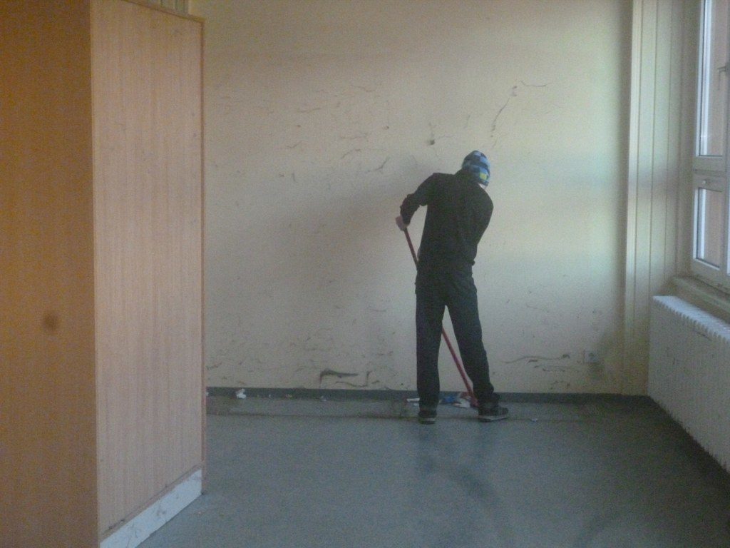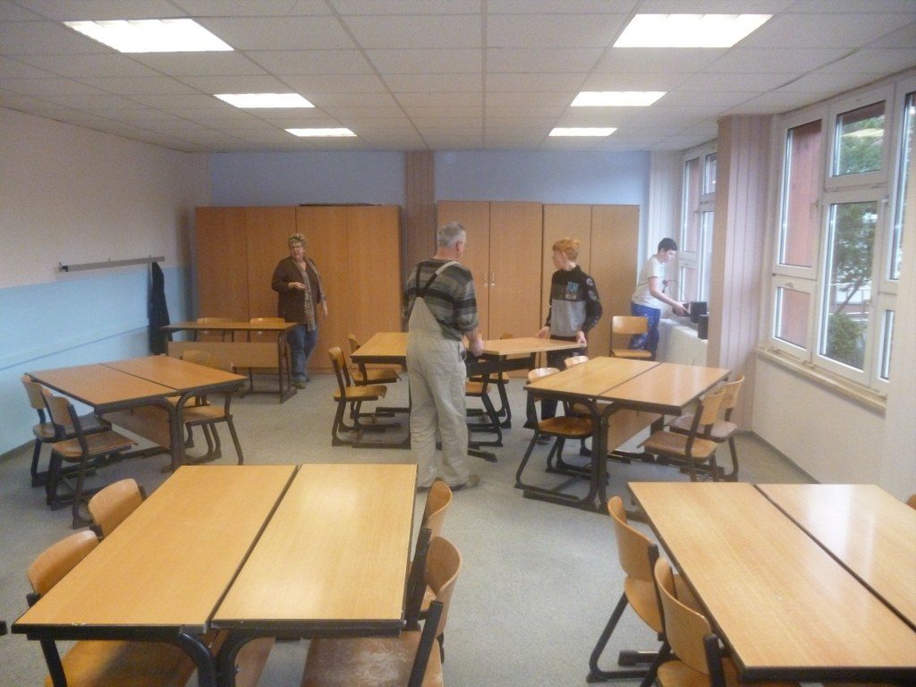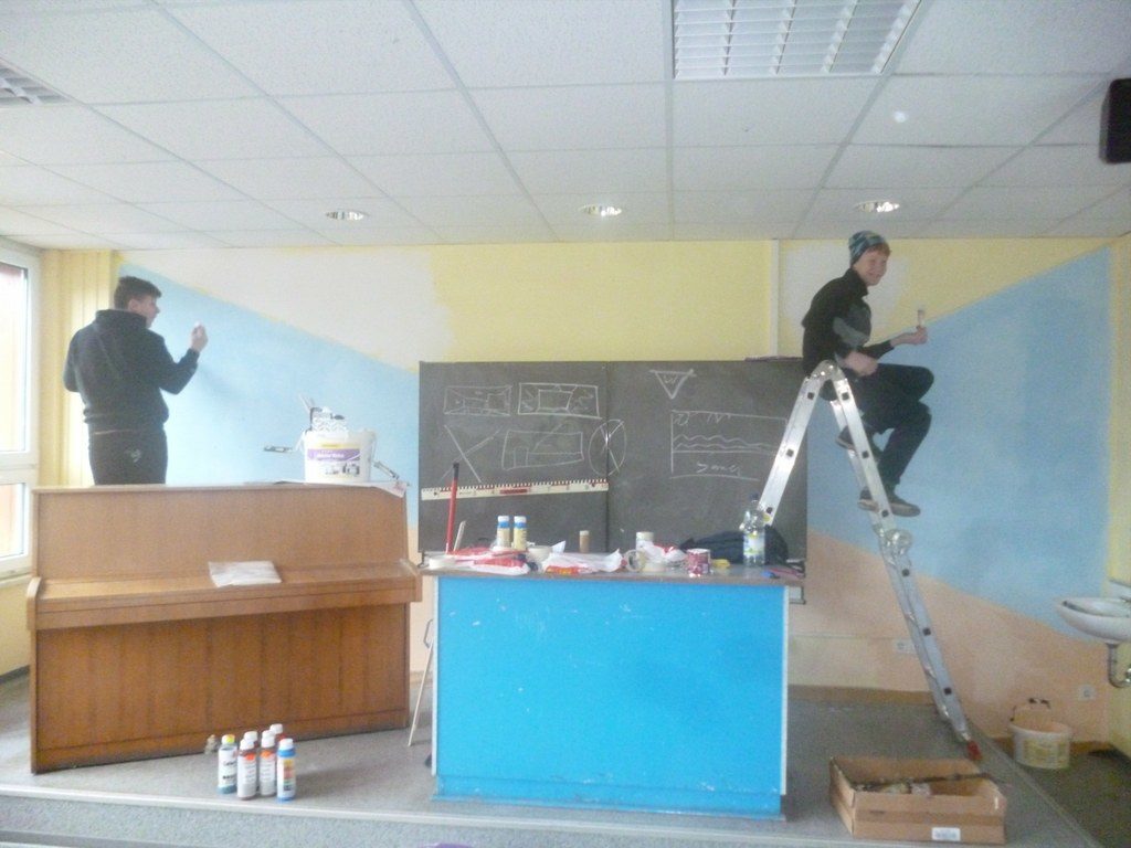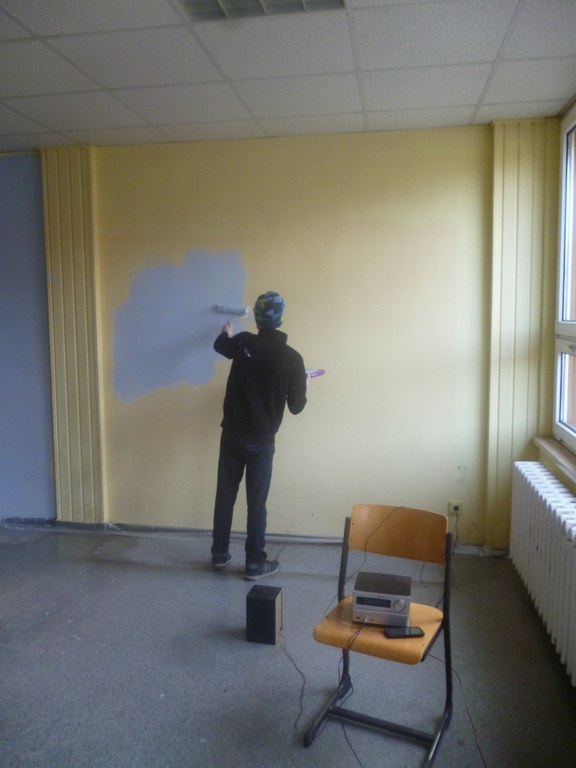 Am 10. und 11.02.2014 wurde der Kunstraum im Rahmen der Klassenraumrenovierungen durch die Schüler der Sekundarschule „Thomas Müntzer“ Ausleben in Angriff genommen. Kurz bevor das 2. Halbjahr wieder losging, sollte der Klassenraum der 8b endlich zu einem „richtigen“ Kunstraum werden. Vorher war er sehr trist und nicht besonders künstlerisch inspirierend, außerdem war er schon seit Jahren nicht mehr renoviert worden. Wenn täglch Klassen ihren Kunstunterricht dort absolvieren, wobei auch mal mit Wasser und Farbe gespritzt wird, kann man sich vorstellen, wie einige Bereiche des Raums aussahen.