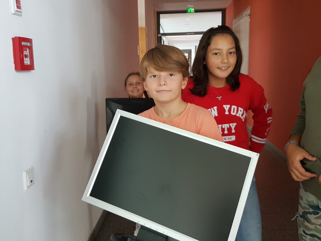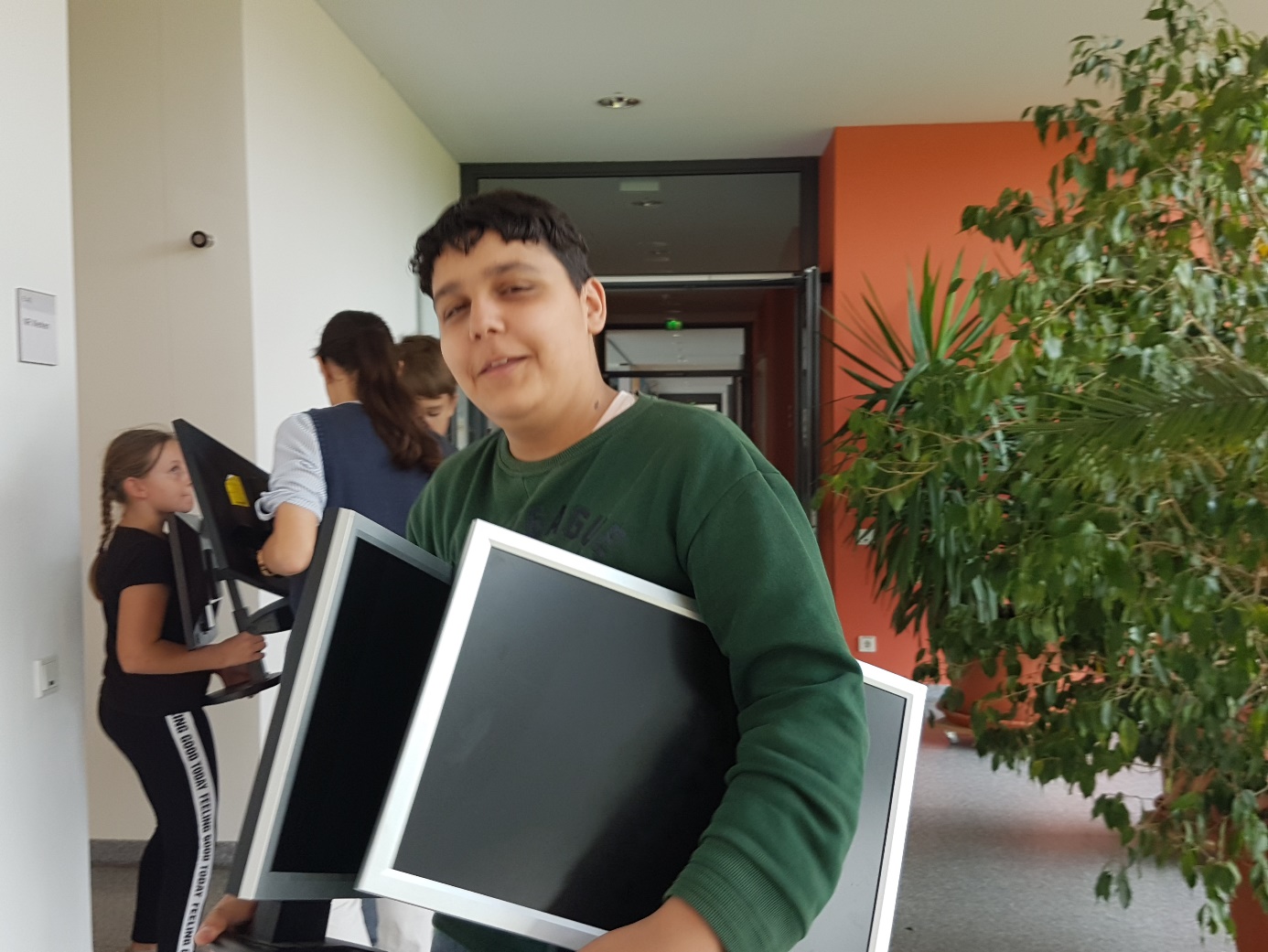 In den Klassenraum bringen 2In der Schule angekommen, halfen die Schüler der Computerklasse (AG Computer/ Kreativ im Netz) tatkräftig mit. Es war für alle eine gute Gelegenheit nochmal zu wiederholen welche Anschlüsse es an einem Monitor gibt und was es bei der Inbetriebnahme zu beachten gibt. Mit diesem Wissen ausgerüstet, konnten sie dann selbst die Altgeräte abbauen und die neuen Geräte anschließen. Nun können wir wieder alle PCs von den Schülern verwendet werden.