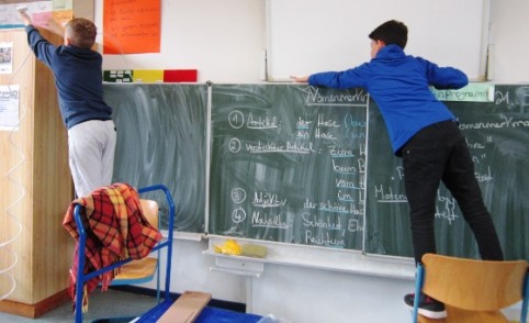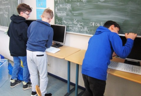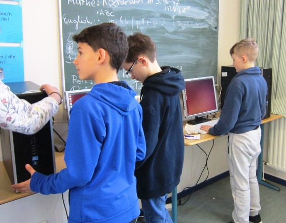 Die Rechner sind nun erst einmal mit Linux installiert worden und warten auf Ihre Umzug in die Klassen. Die Idee ist es, dass dann jeweils vier SchülerInnen der fünften Klasse unter Aufsicht der Medienassistentin Frau Klosner die PCs in ihre Klassen transportieren, dort anschließen und dabei auch Fotos von der Aktion gemacht werden. Die SchülerInnen sind idealerweise anschließend auch für die Pflege und Wartung zuständig, in dem Rahmen, wie sie das können.