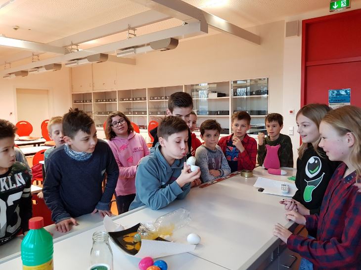 Während Frau Sonntag und Frau Liepold anhand unterschiedlicher Experimente das Osterei auf Mission schickten, indem ich Mitmachexperimente wie zum Beispiel: „Wie kommt das Ei in die Flasche?, Wieso hüpft das Ei aus dem Eierbecher in den anderen?, Rührei ohne Wärmezufuhr?; Wie stabil ist eine Brücke aus Eierschalen? oder „Wie trennt man den Dotter vom Eiweiß?“ anbieten, reflektieren sie altersgerecht über die soeben gemachten Erfahrungen. Die Schülerinnen und Schüler bemühen sich um Antworten auf die Fragen: Was ist Druck, was ist Unterdruck, worin besteht der Unterschied, was ist eine chemische Reaktion, und und und….