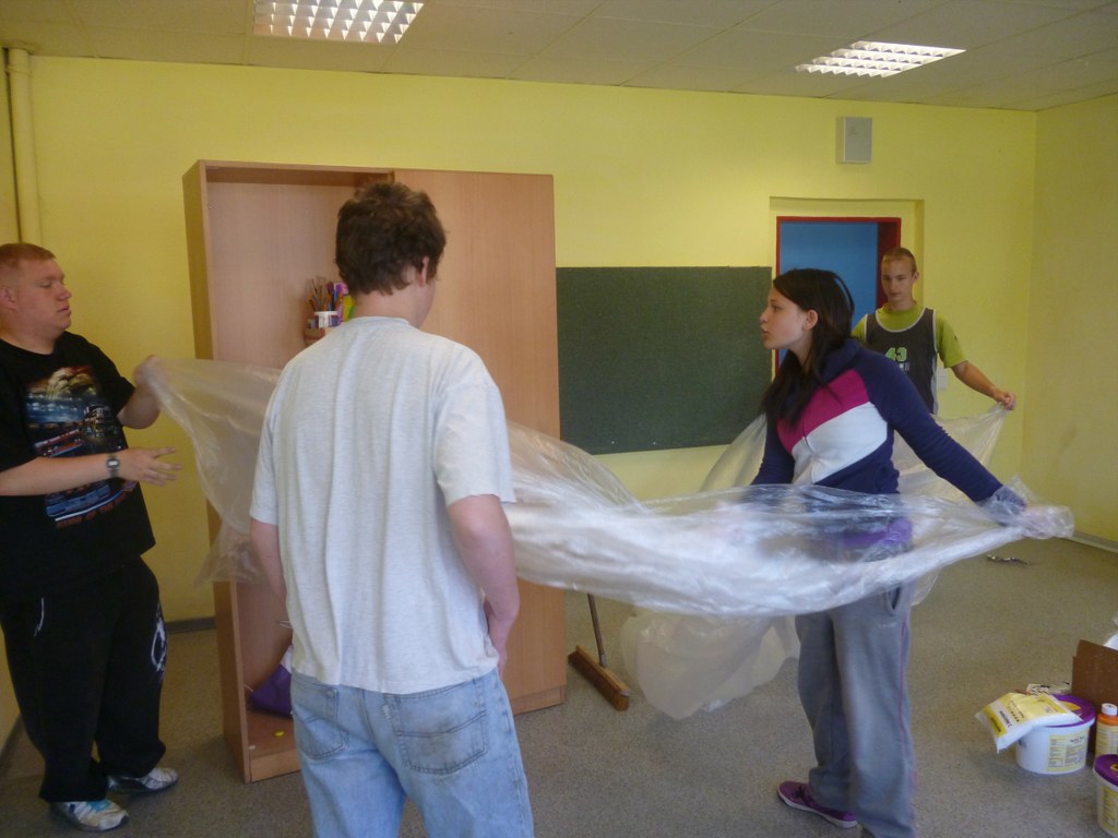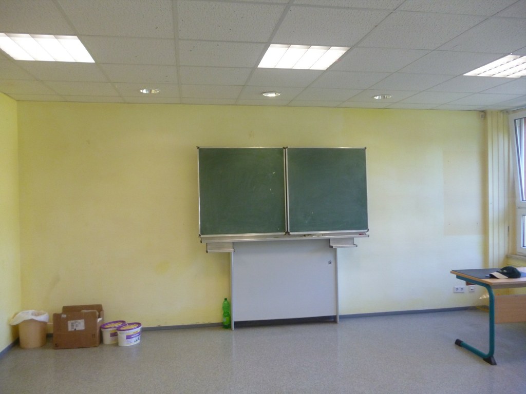 Der Klassenlehrer Herr Giffey hatte bemerkt, dass die Leistungen der bisherigen Klassen sehr beachtlich waren und wollte dies auch gerne in seinem Klassenraum für seine Klasse umsetzen. Die Klasse hatte ein sehr schönes Jahn an unsere Schule gehabt und wir freuen uns daher auch auf die nächste Klasse der Bördelandschule, die im kommenden ihren Abschluss bei uns absolvieren wird. Die aktuelle Klasse möchte sich daher für dieses tolle Jahr bedanken und der nächsten Klassenstufe ein Geschenk hinterlassen, damit diese sich bei uns ebenso, wenn nicht sogar noch wohler fühlen. Es wurde beschlossen die Farben Weiß und Orange zu wählen, da diese Kombination noch nicht von anderen Klassen verwendet wurde. Um noch eine Besonderheit einzufügen wurde beschlossen nicht nur die übliche Halbierung der Wände als Kontrast zu verwenden sondern zwei Schrägen an der Tafelwand die von den oberen Ecken der Wand zu den Tafelecken laufen. Dadurch wurde in dem recht kleinen Raum eine Tiefe erzeugt, die für diesen Raum angenehm wirkt. Beinahe die gesamte Klasse machte bei dem Projekt mit und war mit viel Begeisterung dabei.