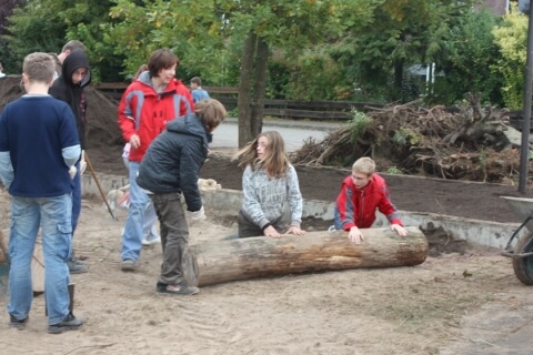 Nachdem wir uns in der Schule auf einen Plan zur Umgestaltung des vorderen Schulhofes geeinigt hatten und der Förderverein der Umsetzung der Idee die finanzielle Rückendeckung gegeben hatte, wurde in sechs Projekten (Bau von Nistkästen, eines Insektenhotels, einer Trockenmauer, von Hundertwassersäulen und eines Grünen Klassenzimmers, Pflanzen heimischer Sträucher) z.T. bei strömendem Regen erst einmal der Abriss der vorhandenen Fläche mit Maschinenunterstützung vorgenommen. Anschließend waren viele tatkräftige Helfer dabei, Sand und Rindenmulch zu schaufeln, Baumstämme und Steine zu bewegen, Löcher für die Pflanzen zu graben, … Äußerungen wie: „Ist das immer noch nicht tief genug?“ gaben die körperliche Herausforderung dieser ungewohnten Arbeiten deutlich wieder.
