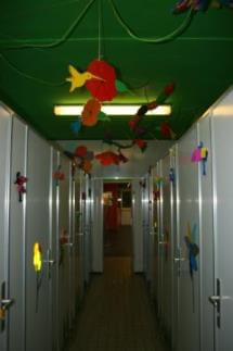 Und wer könnte besser entscheiden, was für ein gesteigertes Wohlbefinden zu verändern war, als die Kinder selbst. Ziel war es, möglichst viele Kinder der Schule an diesem Umgestaltungsprozess teilhaben zu lassen. Und so ging das Projekt schließlich von statten: Zunächst wurden innerhalb der Klassen Ideen für Themen gesammelt (z.B. Star Wars, Dschungel, Witze und Sprüche, Ritter usw.). Die WC-AG (15 Kinder aus den Klassen 2 bis 4) wählte jeweils drei Vorschläge für das Jungen- und Mädchen-WC und gestaltete zu jedem Thema Entwürfe in Form von Modellen oder Bildern. Diese wurden in der Aula ausgestellt und die gesamte Schülerschaft stimmte über die Themen ab. Die Mehrzahl der Mädchen stimmten für ein Dschungel-WC, fast alle Jungen für das Thema Star Wars. Im Anschluss machte die AG eine Ausstellung für wichtige Eltern, die Hausmeisterin, Schulleitung etc., um die schulischen Entscheidungsträger von ihrem Vorhaben zu überzeugen und Helfer zu finden. Innerhalb der nächsten Wochen gestalteten die Kinder der WC-AG zahlreiche Objekte, die thematisch passten und die Toilettenräume verschönern sollten. Es entstanden Star Wars-Figuren, Planeten und Roboter für das Jungenklo, sowie Pflanzen, Tiere, Lianen und sogar ein Wasserfall bei den Mädchen.