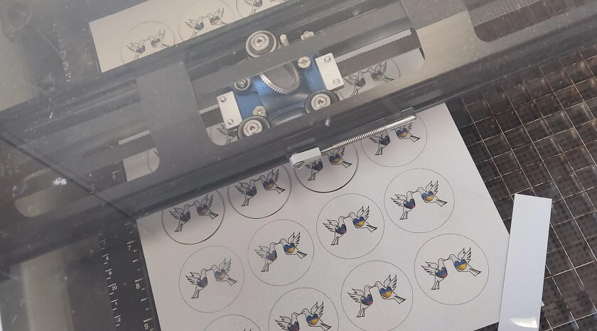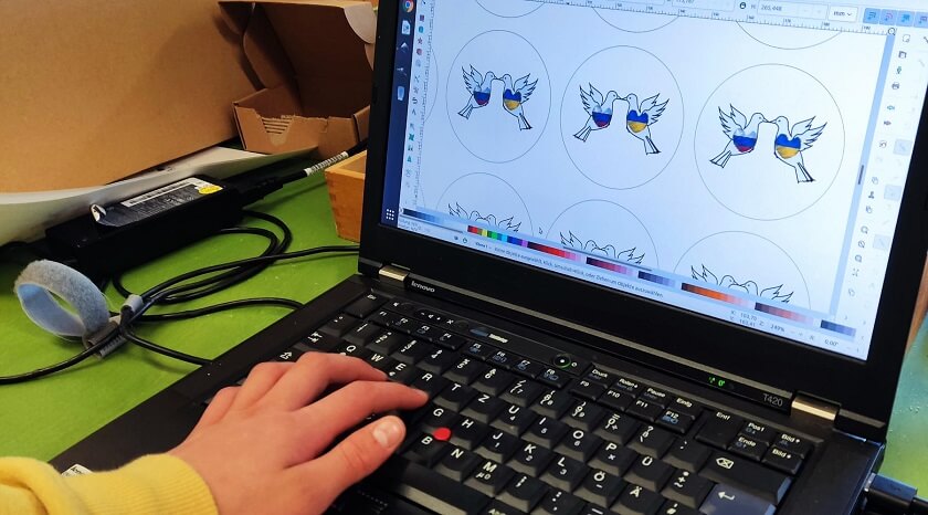 Unter https://freesvg.org/ gibt es Vektorgrafiken, die legal verwendet werden können. Mit diesen Grafiken wurden in Inkscape die Motive gestaltet und dann zweimal gespeichert. Einmal als PDF, um es auf dem Farblaser auszudrucken und einmal als SVG, um die Motive mit dem Lasercuter genau aus zu schneiden. Alternativ geht das Ausschneiden auch mittels eines Kreis-schneiders gut. Das Motiv wurde dann mit einer Buttonmaschine zu einem fertigen Button verarbeitet (siehe Link https://www.badgematic.de/de/schul-special-buttonmaschine-flexi). Die Schülervertretung plant weitere Spendenaktionen, hierbei sollen die Buttons dann gegen eine Spende verkauft werden. Ein Kollege dessen Wurzeln in der Ukraine sind, sucht noch nach einer Hilfsorganisation, die sich insbesondere um die Belange von Kindern und Jugendlichen kümmert, dort soll das Geld dann gespendet werden.