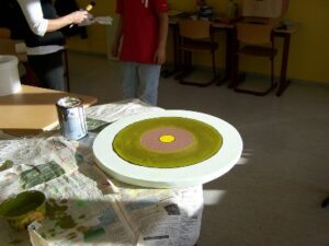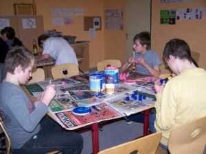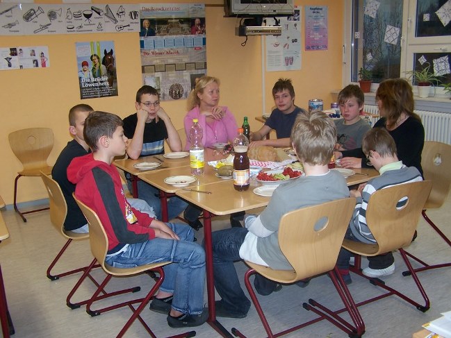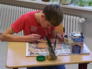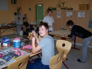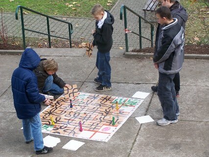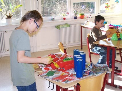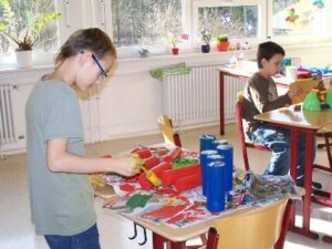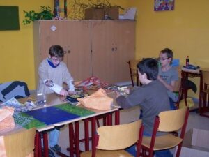 Die gesamte Schule hatte eine Projektwoche, in der die einzelnen Klassen ihre gewählten Spiele entwarfen und bauten. Die Morgenstunden begannen oftmals mit einem gemeinsamen Frühstück und der notwendigen Absprachen für den Tagesablauf. Anschließend arbeitete jeder emsig an seiner Aufgabe, allein oder in kleinen Gruppen.