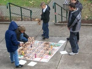 Im Zeitraum vom 23.11.-27.11.2009 baute jede Klasse ein eigenes Spiel im Großformat. Einmal im Monat findet eine Spielstunde statt, in der alle Spiele auf dem Hof oder im Schulhaus aufgebaut und von den Schülern genutzt werden können. Auch die Förderstunden können dafür genutzt werden. Aufgrund der knappen Haushaltskassen und dem kindlich – jugendlichen Bedürfniss nach Spielen, kamen Schüler und Lehrer auf die Idee, Spiele nicht nur zu kaufen, sondern selbst zu bauen. Die Spiele sollten groß genug sein damit sie auch auf dem Hof genutzt werden können und es möglich ist, dass mehrere Schüler daran spielen können. Wichtig war uns, dass die Schüler gemeinsam etwas erstellen, was sie dann auch gemeinsam während der Förderstunden oder an unseren Spieletagen nutzen können.