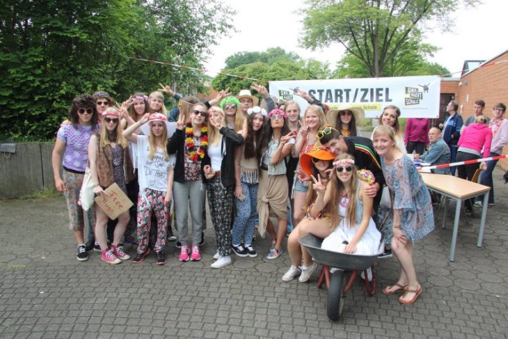 Unser Spendenlauf des 10. Jahrgang, der nun am 21.06.2016 stattgefunden hat, war ein voller Erfolg. Eröffnet wurde der Lauf von Frau Hackemeyer und Herrn Tielbürger. Wir haben mit 150 Zehntklässlern über 800 Euro gesammelt, welche nun an das Projekt in Afrika – die Fountain School in Nairobi – weitergegeben werden. Der Lauf hat in Hippie Kostümen stattgefunden, da wir parallel unsere Mottowoche gefeiert haben. Für Musik sorgten das Abschullskommitee und unser Schulradio Radioactive (www.radioactive.cool). Wir hoffen, dass sich die Veranstaltung an unserer Schule etabliert.