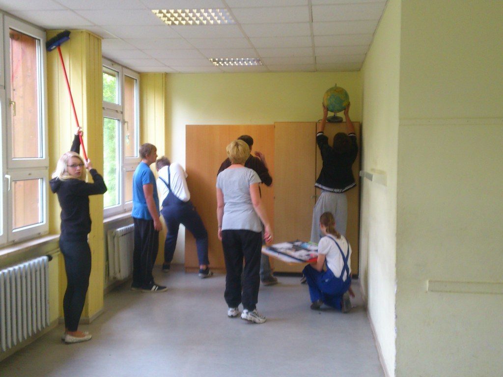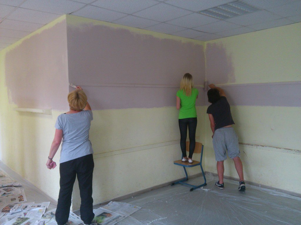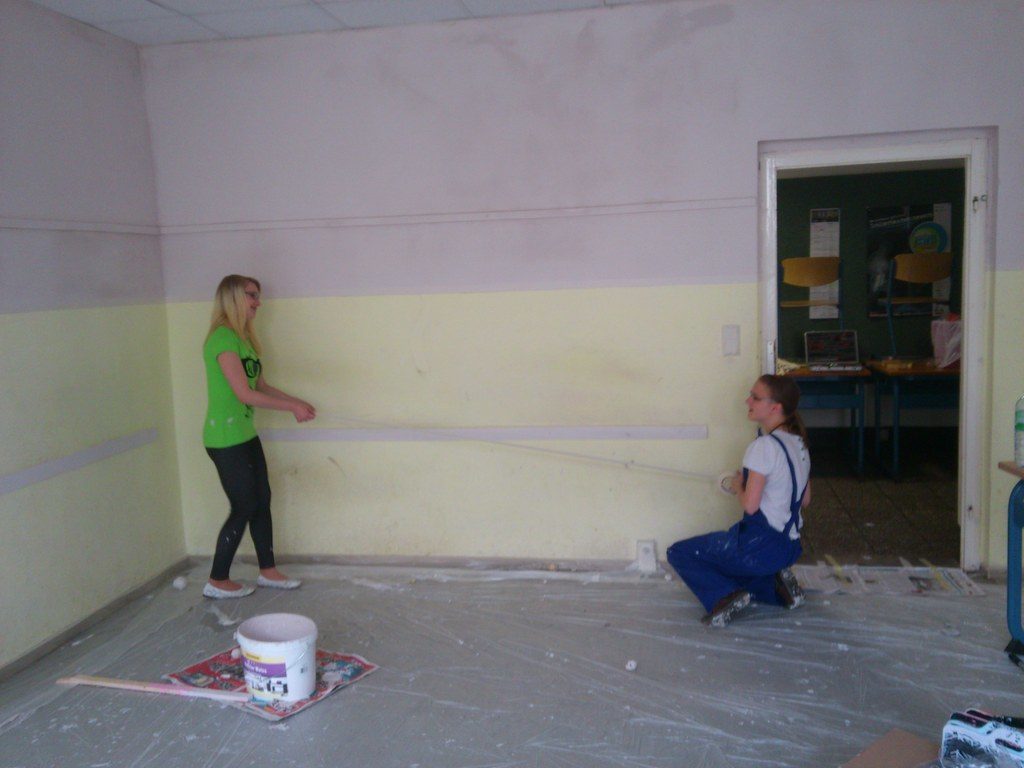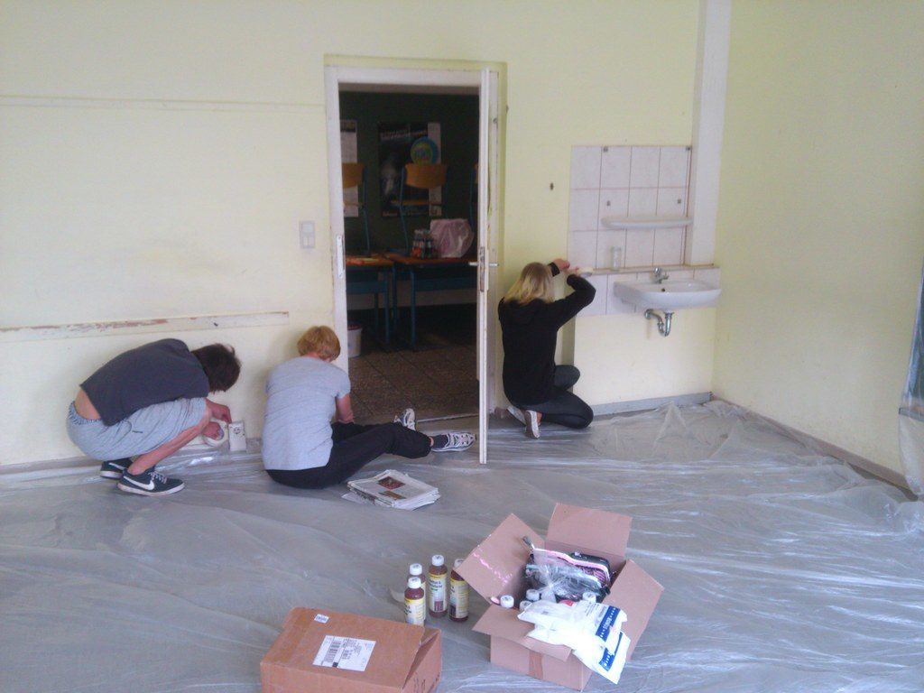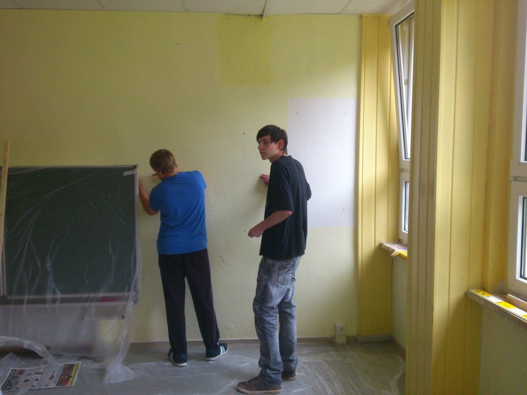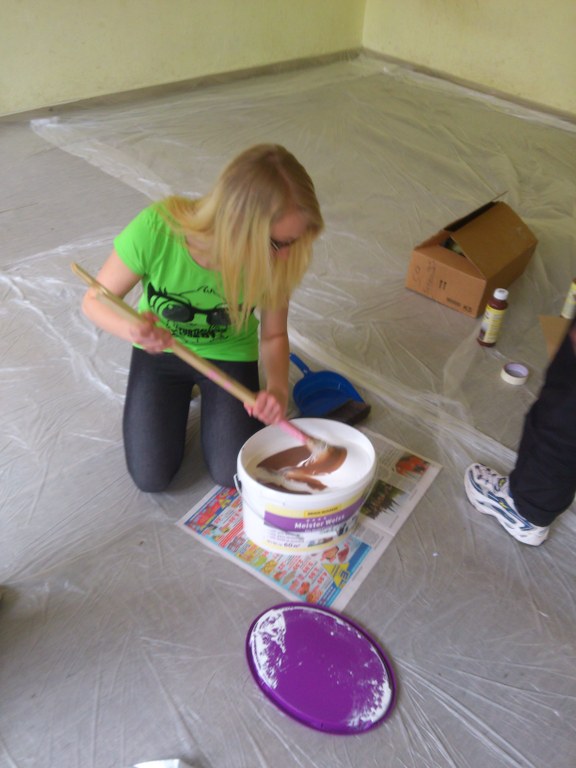 „Gemeinsam planen – los geht’s!“ Die Klasse überlegte zusammen mit ihrer Klassenlehrerin Frau Ulrike Wieczorek wie man den Raum am besten gestalten könnte. Rot, Grün und Blau wurden bereits verwendet und sahen auch gut aus, doch man wollte eine persönliche, unverwechselbare Note haben. Die Kombination aus zwei Farben hatte sich bewährt und sollte auch diesmal beibehalten werden. Warme Farben sollten es sein, die beruhigend und angenehm wirken. Letztlich fiel die Entscheidung auf „eierschalfarben“ und „cappuccinobraun“ – ein „farbsymbolisches Frühstück“ sozusagen, das nicht nur einen guten Start in den Tag verspricht, sondern den ganzen Tag über motivieren soll. Als Termin wurde Samstag der 25.05.2013 ausgewählt, also ein Tag in der letzten Schulwoche für die 10. Klassen. So wurde der Unterrichtsverlauf nicht gestört man konnte entspannter arbeiten. Letztlich waren Stefanie Schulz, Jenny Herzberg, Leon Groß, Philipp Rose, Dominik Lübeck, Max Niehage, Frau Ulrike Wieczorek und Herr Christian Grabow vor Ort, um die Ideen in die Realität umzusetzen. Auch wenn es nicht die ganze Klasse war, war dies dennoch vorteilhaft, da man sich somit nicht ständig im Weg stand und der Raum ohnehin etwas kleiner ist.