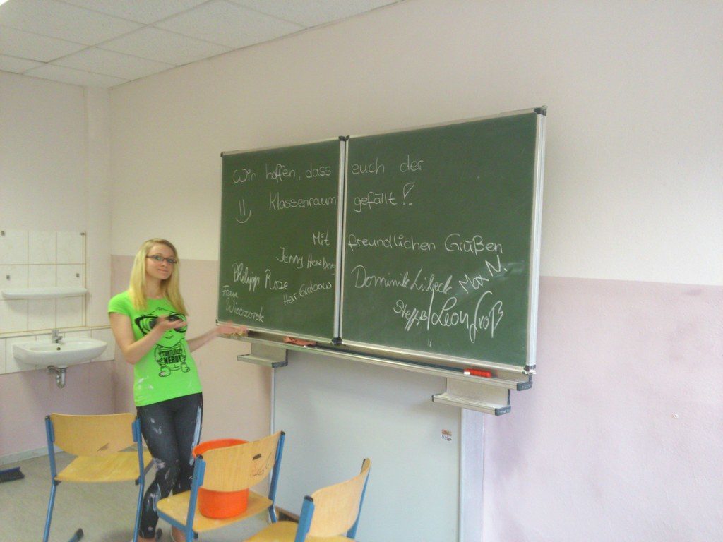Projekte zur Lernumfeldgestaltung wurden bereits von drei Klassen an der Schule erfolgreich durchgeführt. Auch die Klasse 10b wollte zeigen was sie drauf hat, allerdings stand noch eine Frage im Raum: „Warum soll man überhaupt noch am Lernumfeld arbeiten,wenn die Schule für uns eh bald vorbei ist?“ Eine berechtigte Frage, bei der aber auch nicht außer acht gelassen wurde, dass die anderen Projekte den Teilnehmern sehr viel Spaß und viele schöne Erinnerungen bereitet haben. Den eigenen Klassenraum zu streichen und dann nichts mehr davon zu haben, war dennoch nicht sehr verlockend. Gab es noch eine Möglichkeit ein solches Projekt durchzuführen und irgendwie davon doch noch zu profitieren? Die Lösung war nicht nur genial, sondern auch sehr lobens- und beachtenswert. Der Raum für die mündlichen Prüfungen wurde in diesem Jahr als Klassenraum für eine 5. Klasse genutzt und sah absolut furchtbar aus. Flecken, Kratzer und alte, funktionslose Jalousiehalterungen zeugten von dringendem Renovierungsbedarf. Für die Lernmotivation war dieser Zustand nicht sehr förderlich und als Atmosphäre für eine Prüfung, bei der man ohnehin aufgeregt genug ist, erst recht nicht. Was lag also näher als diesen Raum zu gestalten und somit bei der Prüfung vielleicht ein bisschen entspannter zu sein? Im Nachhinein würden die Kleinen dann zudem einen nagelneuen Raum haben, in dem das Lernen auch Spaß machen kann. Das Projekt diente also nicht nur der Abschlussklasse selbst, sondern stellte auch noch ein sehr schönes Abschiedsgeschenk an die Schule und spätere Klassen dar. Um den Effekt noch zu verstärken wurde das Projekt so geheim wie möglich gehalten. Wie bei den Projekten zuvor unterstützte die Schulsozialarbeit und die Klassenleitung gemeinsam mit „Das macht Schule“ die Planung und Durchführung und kümmerte sich vor allem um die Dokumentation und die Beschaffung der Materialien.