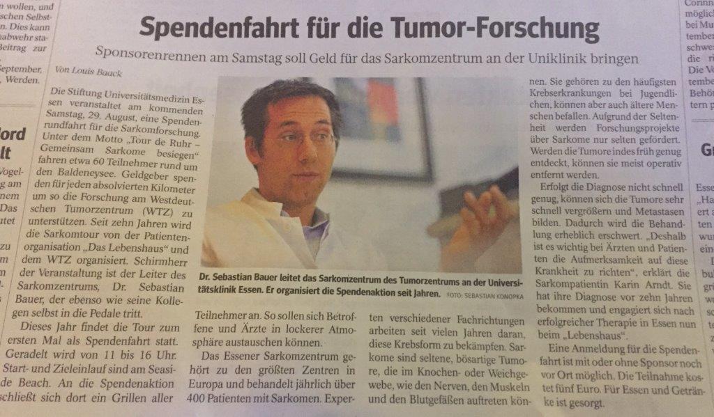 Hintergrund: Sarkome gehören zu den häufigsten und gefährlichsten Krebserkrankungen bei Kindern, Jugendlichen und jungen Erwachsenen, können aber Menschen aller Altersgruppen betreffen. Verglichen mit Lungenkrebs oder Brustkrebs sind Sarkome dennoch selten, weshalb Forschungsprojekte über Sarkome nur selten gefördert werden können. Seit 10 Jahren wird die Sarkomtour gemeinsam von Ärzten des WTZ und engagierten Patienten und Mitarbeitern der Sarkom-Patientenorganisation „Das Lebenshaus“ organisiert. Das Sarkomzentrum am WTZ – Das Essener Sarkomzentrum gehört zu den größten Zentren in Europa und behandelt jährlich über 400 Patienten mit Sarkomen aus ganz Deutschland. Experten verschiedener Fachrichtungen arbeiten seit vielen Jahren als interdisziplinäres Team zusammen. Das Labor für Translationale Sarkomforschung entwickelt und untersucht neue Medikamente an Sarkommodellen und übersetzt diese Ergebnisse in klinisch anwendbare Therapien. Das Lebenshaus ist eine gemeinnützige Organisation für Patienten mit Sarkomen und GIST, die sich seit vielen Jahren für die Verbesserung der Behandlungssituation von Sarkompatienten erfolgreich engagiert.