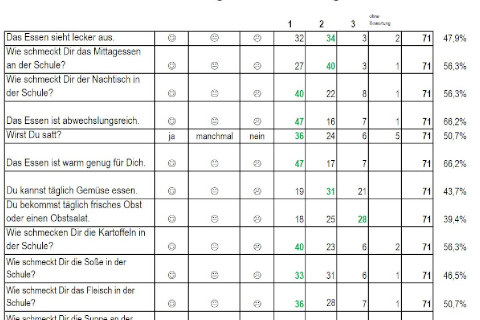 Wir sind nun sehr optimistisch, dass unser Schulessen weiter so gut bleibt, die Schüler zufrieden bleiben und vielleicht doch mehr Kinder ihre warme Mittagsmahlzeit bekommen können. Wichtig ist und bleiben die Kommunikation und die gemeinsame Arbeit zwischen Schule, Eltern und dem Essensanbieter. Wir bedanken uns nochmal bei allen Schülerinnen, Schülern und Eltern, die an unserer Umfrage teilgenommen haben.