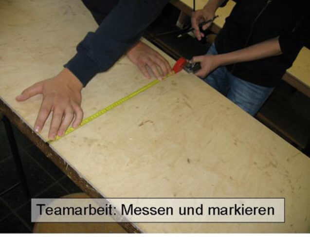 Da sich das bisher verwendete Material (Hartfaserplatten) als sehr kurzlebig herausgestellt hat, suchte ich in Kassel eine „Max Bahr“- Filiale auf, um mich über mögliche Alternativen zu informieren. Nachdem ich durch einen Mitarbeiter des Hauses sehr kompetent beraten wurde, fiel meine Wahl auf 12 Millimeter starke Sperrholzplatten. Im Laufe des Gesprächs wies mich der Mitarbeiter auf die Initiative “Das macht Schule” hin. Mit dem damit verbundenen Rabatt konnten wir im Rahmen der zur Verfügung stehenden finanziellen Mittel bleiben und alle 12 Werkbänke im Werkraum mit Platten ausstatten.